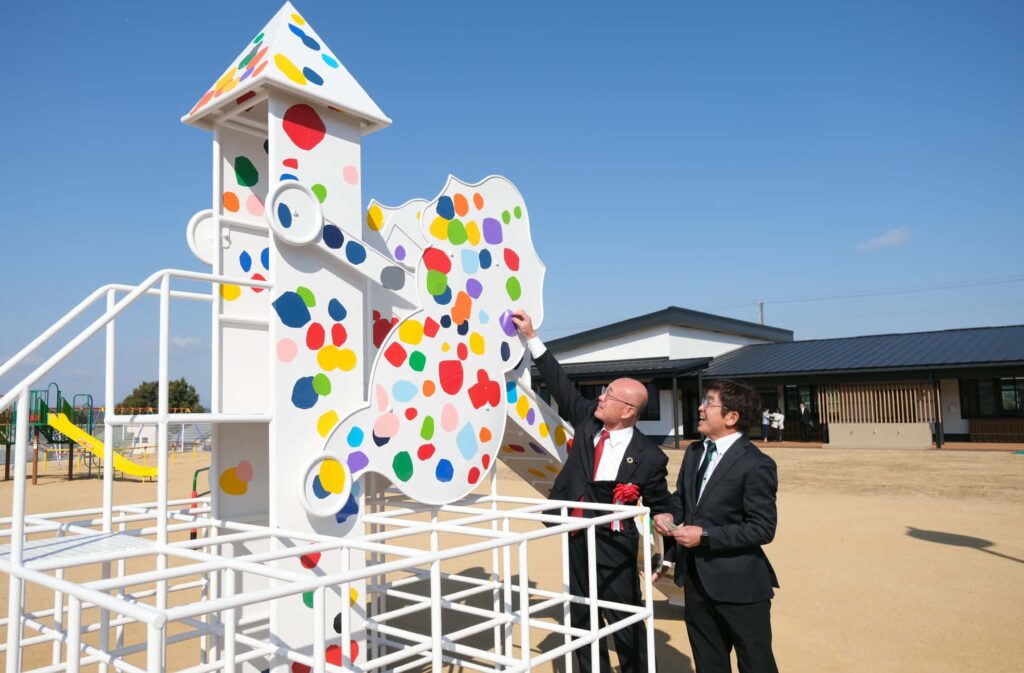 平屋建てのきれいな園舎で、屋外には築山や芝生広場が広がり素晴らしい園舎となっております。ここから未来に向かって大きく羽ばたく子どもが育っていくことを願っています。