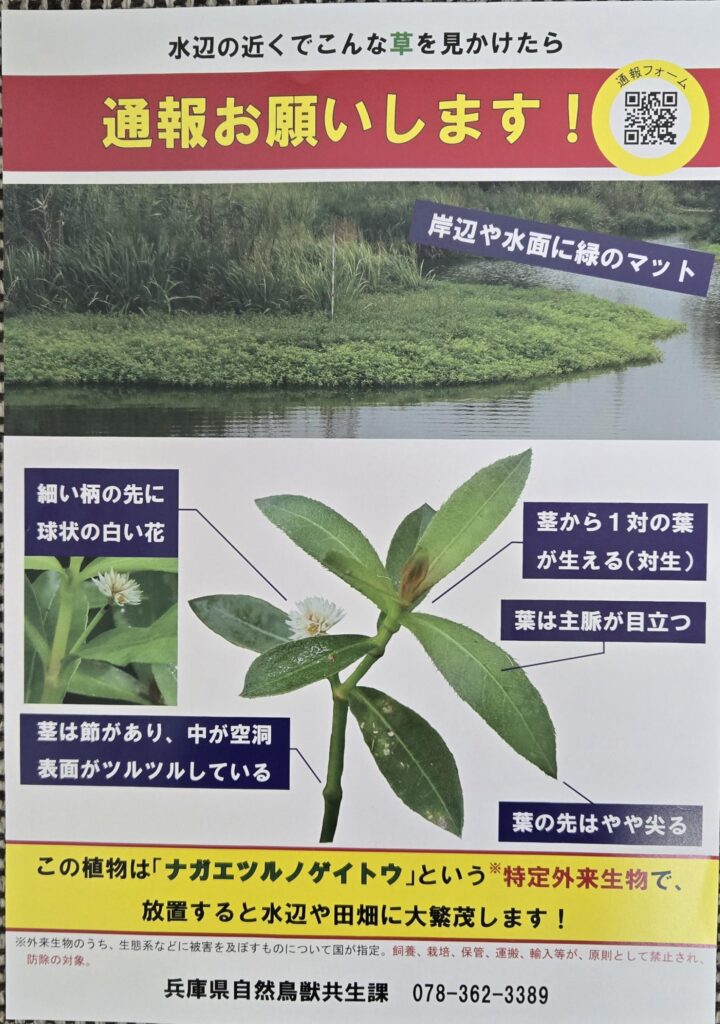 本日、朝一市役所へ小野書藝家G展のお祝いメッセージを岸本代表へお渡しし、作品を鑑賞。(私には書けない)庁内3か所を回り業務を済ませ、西脇市のオリナスで開催の特定外来生物対策研修会に参加させていただきました。「ナガエツルノゲイトウ(放置すると水辺や田畑に大繁茂する。水路を詰まらせる。)」の現状や防除方法等を確認しました。県も昨年の12月補正予算等で5,400万円を追加し対策を実施しています。草刈り機で刈るとさらに広めるだけとのこと。球状の白い花が特色です。